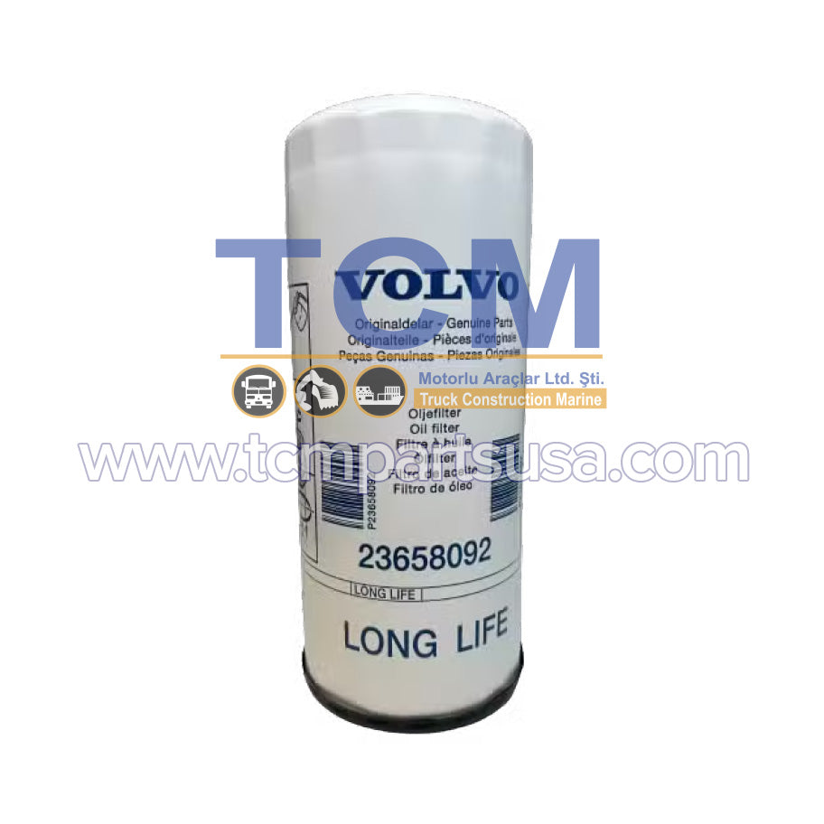 The Volvo 23658092 Engine Oil Filter is a genuine OEM component designed to deliver superior oil filtration in Volvo D11, D13, D16 and Mack MP7, MP8 diesel engines. Built to perform under high-pressure conditions, this filter ensures clean oil circulation, reduces wear on critical engine parts, and supports extended oil change intervals — even in the most demanding heavy-duty environments.